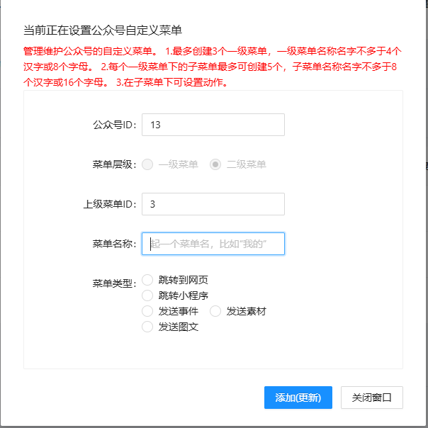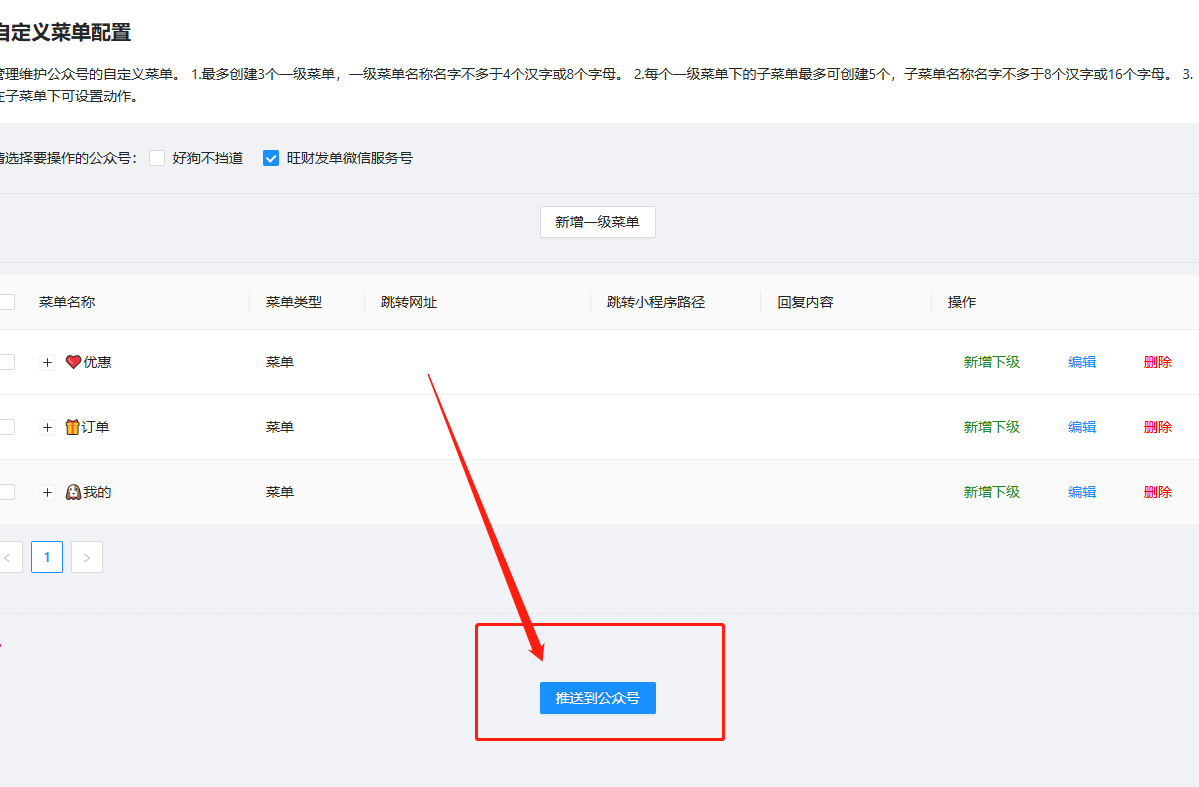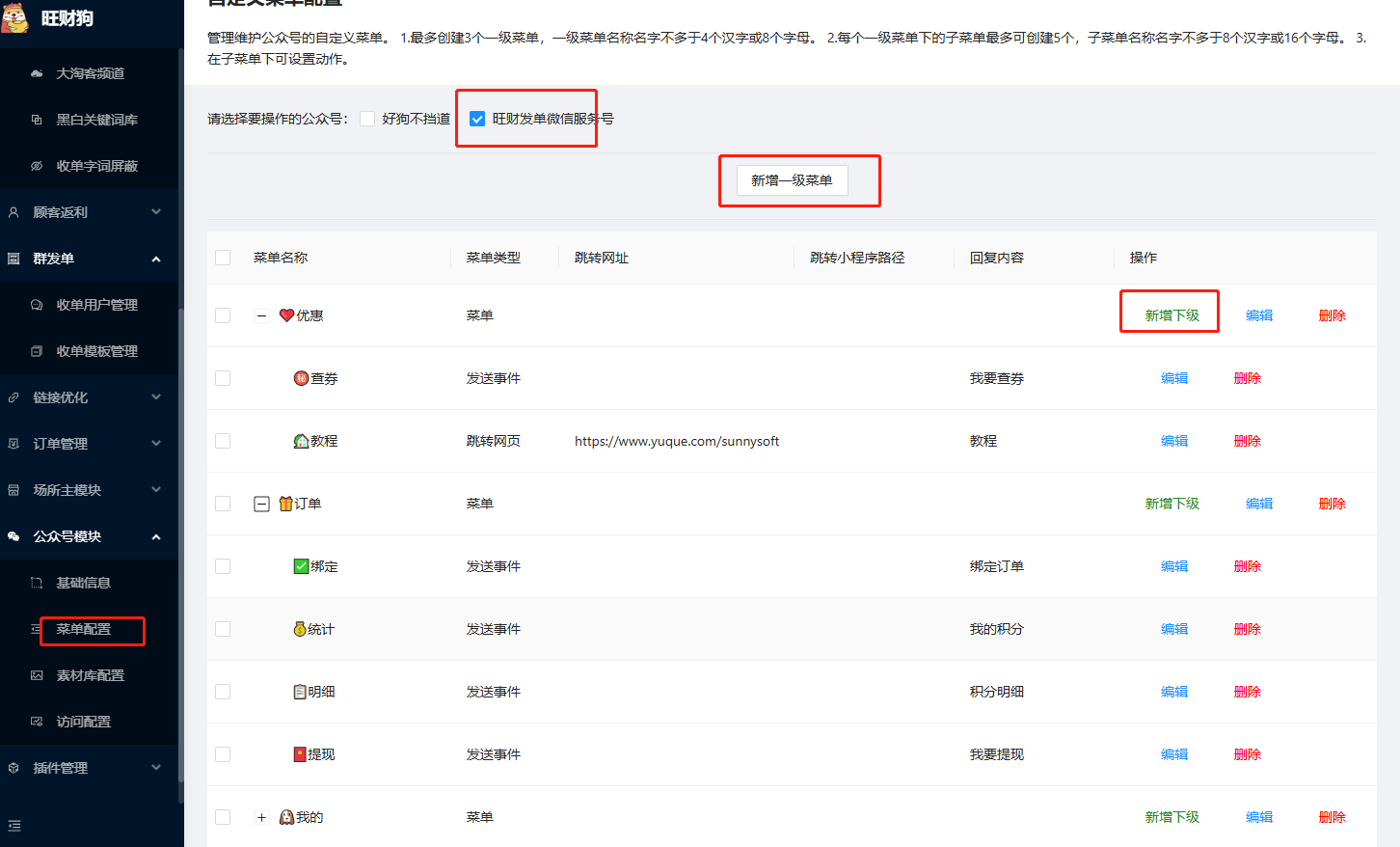 在旺财狗-公众号模块-菜单配置,可以点击公众号然后设置自定义菜单。如图: