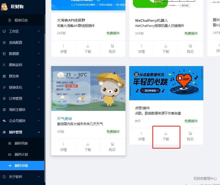 来到旺财狗的“插件管理”-“插件市场”,下载“点歌插件”。如图: