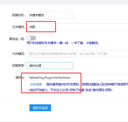 下面选择处理该关键词的插件,选择我们安装并启用的点歌插件即可。