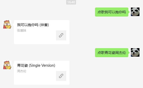 给你的机器人发送关键词+城市名称,比如“点歌青花瓷周杰”或“点歌我可以爱你吗”,查看回复结果,如图: