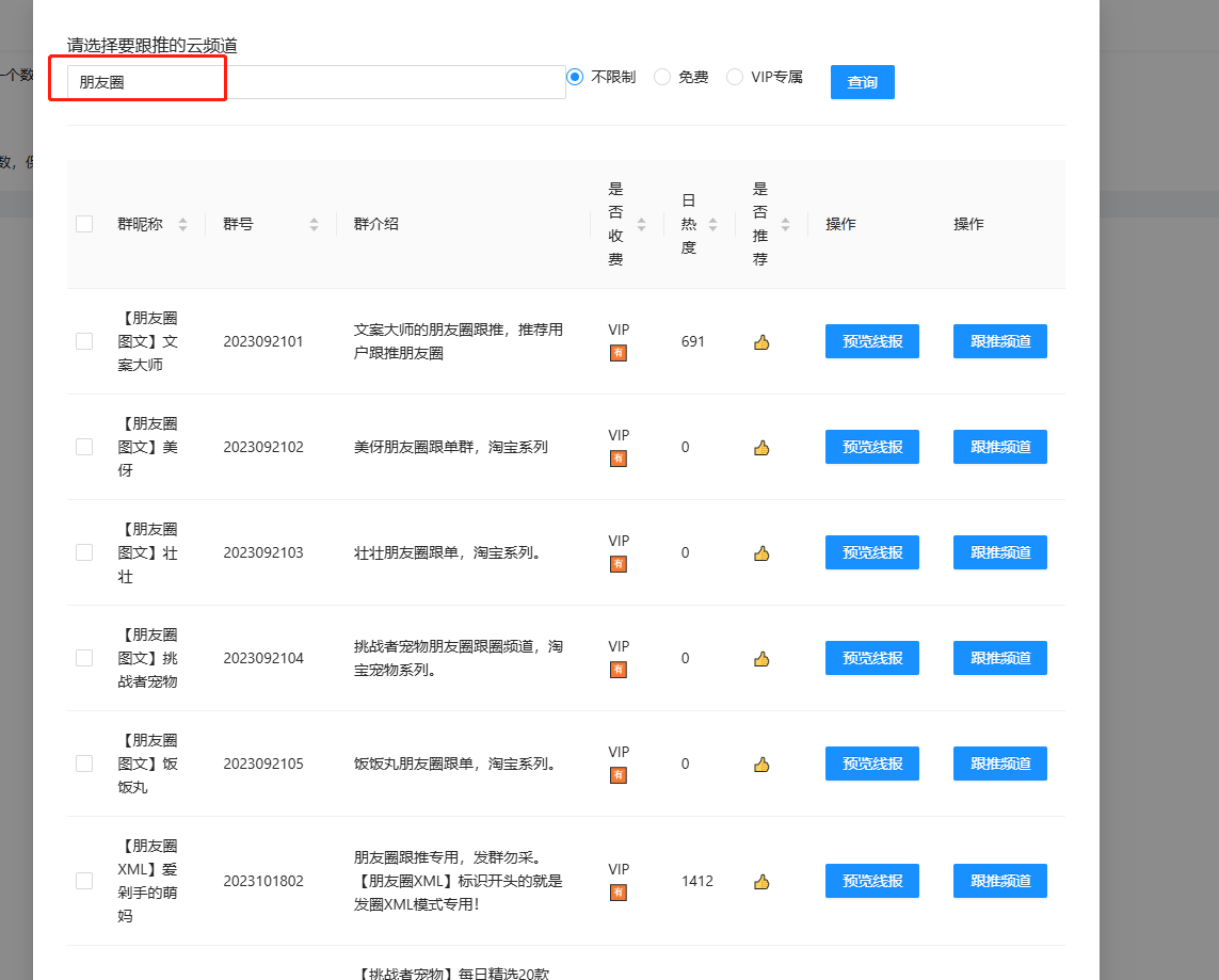 点击云频道后,在搜索框中输入朋友圈,筛选出朋友圈专用频道。选择一个喜欢的点击跟推。如图: