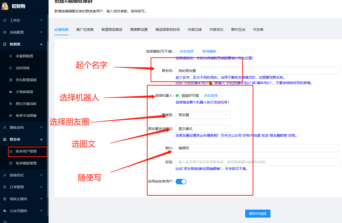 旺财狗-群发单-收单用户管理-新增收单用户-采集云频道数据,如图: