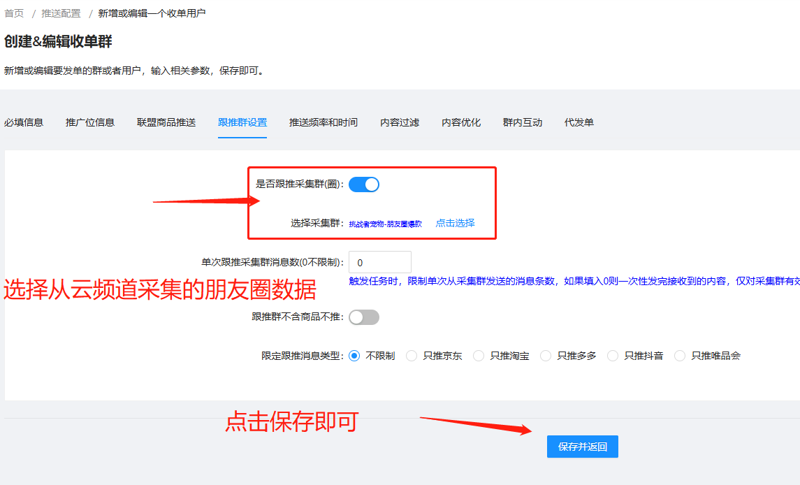 然后切换顶部的跟推群选项卡,在页面中把添加的从云频道采集的朋友圈采集群勾选上,如下图: