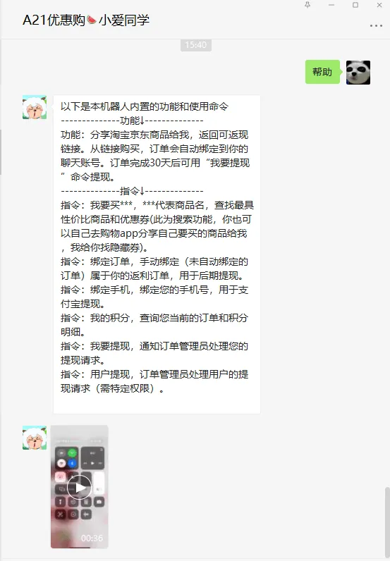 向机器人发送“帮助”,还可获取更多技能。也可以“帮助”这俩字,自定义成视频教程。如图: