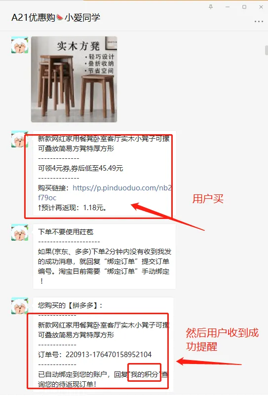用户发一些链接给小助手,小助手自动就返回了可以返现的下单链接。