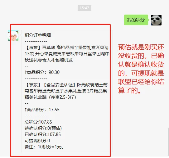 用户回复“我的积分”可以查看自己所有的单子。如图: