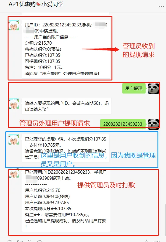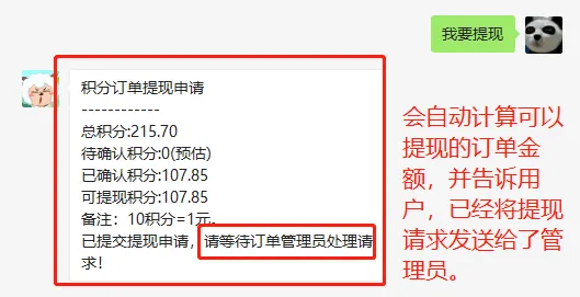 用户回复“我要提现”,系统会自动计算用户可以提现的订单,将订单和提现用户信息算好,发送给订单管理员。