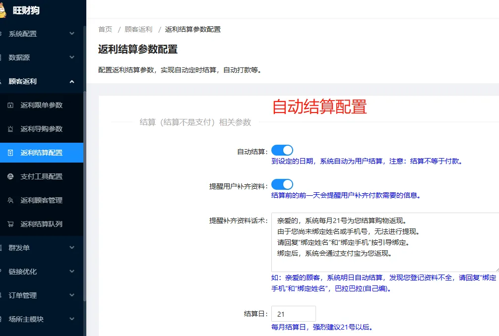 旺财狗的返利功能强大,能实现返利转链、智能佣金比例、自动跟单、自动绑定、自动结算等人性化功能。