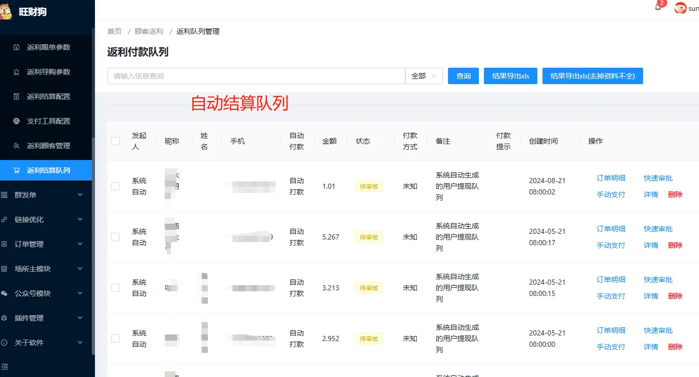 管理员审核通过后,系统会自动打款给用户(需要配置支付宝企业支付账户),或者选择手动支付结算。