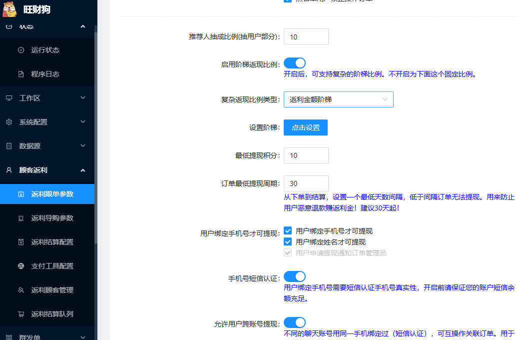 旺财狗支持复杂的返利比例设置,可以设置成全局固定全局阶梯返利全局激励模式等,也可以给某个顾客设置专属的返利模式。