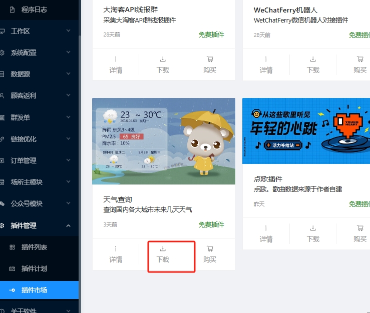 来到旺财狗的“插件管理”-“插件市场”,下载“天气查询”插件。如图: