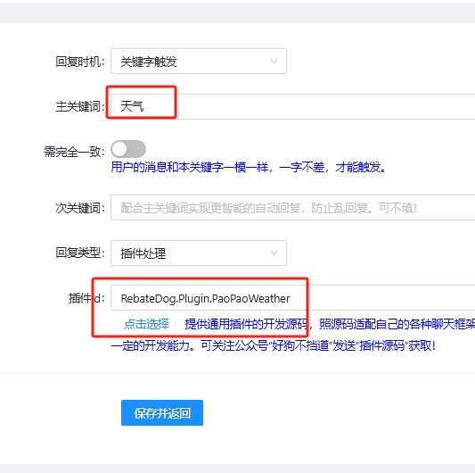 下面选择处理该关键词的插件,选择我们安装并启用的天气插件即可。