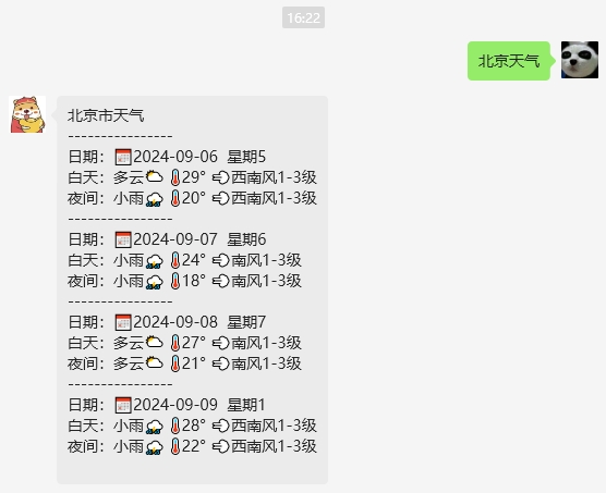 给你的机器人发送关键词+城市名称,比如“北京天气”或“天气北京”,查看回复结果,如图: