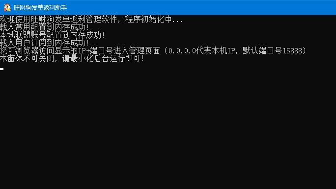 这黑色窗体代表旺财狗已经成功运行,这只是它的后台程序,日常不要关闭,让它静静地运行便可!