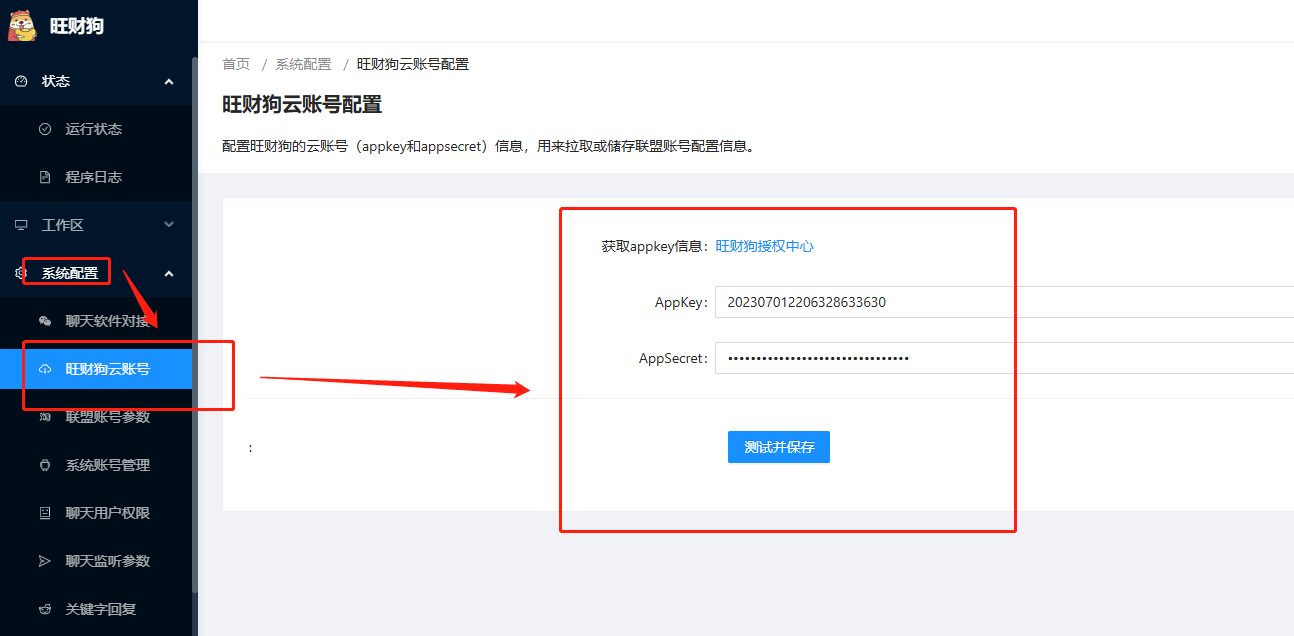 点击旺财狗管理页左侧导航栏“系统配置”-“旺财狗云账号”,把从云中心获取的旺财狗的appkey和AppSecret填入进去,如图: