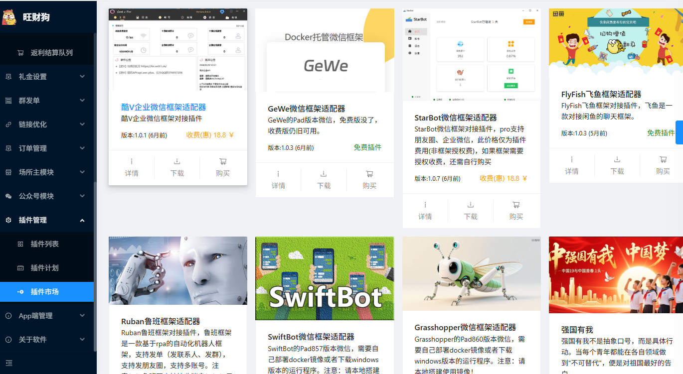 旺财狗中内置的插件市场提供了数十款微信机器人框架,这些都是热心网友提供,总有一款适合您~