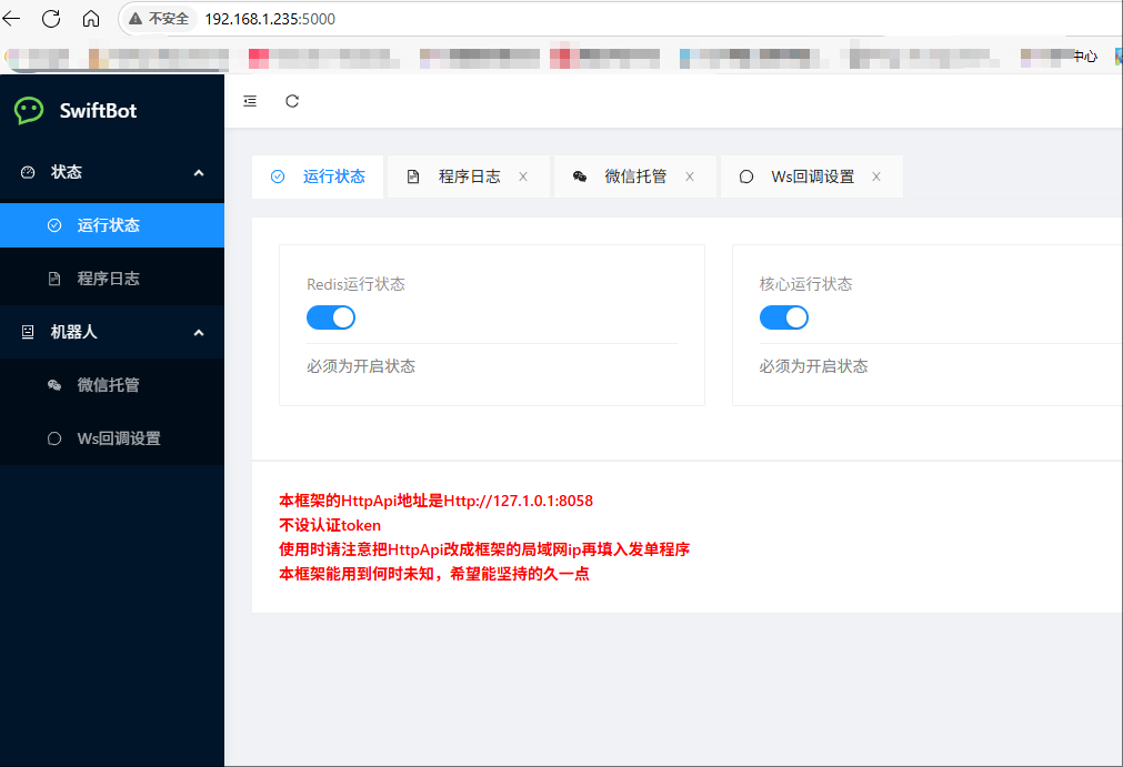 docker run -d --name padchat -p 5000:5000 -p 8058:8058 -v /root/PadData:/app/data crpi-5mft5k2asrq5fkut.cn-hangzhou.personal.cr.aliyuncs.com/zhaoyangguang/pad_chat_middleware:latest这时候查看docker的日志,如果没有异常提醒,就可以访问管理地址IP+端口号5000访问看看是否正常运行了。