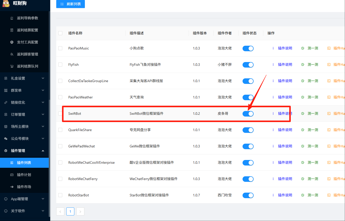 回到旺财狗的插件列表中,找到添加的插件,点击“启用”。