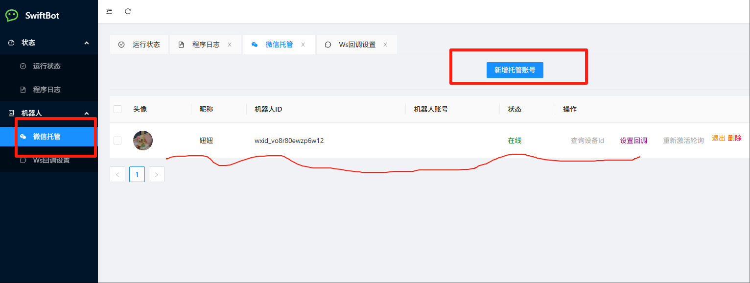 可以对已经登录的机器人进行各种操作,如下线或者重新登录等等。如果是异常下线后,可以来这里重新登录该微信,但是不要选择新托管,这样子会增加风险。