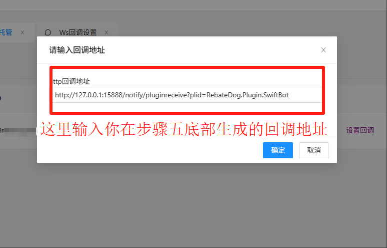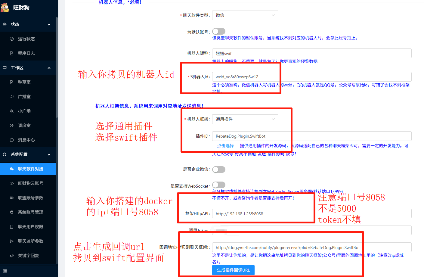 swift网页管理面板管理处需要输入旺财狗提供给插件的消息回调地址,把这个地址输入到机器人的消息通知回调地址栏里面(都会有)。 上面的步骤中已经标识出来了。