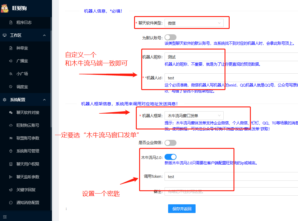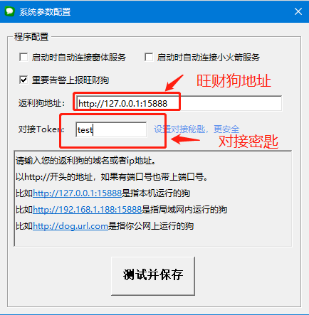 输入“旺财狗服务端的地址”和2.1中创建的机器人对接秘匙。然后点击“测试并保存”,如果成功,就是成功!