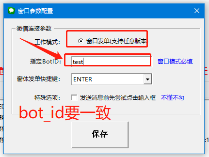 窗体模式,必须旺财狗和机器人端设置的机器人id一致(可以胡编,但是要一样)