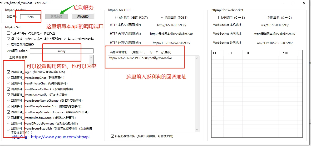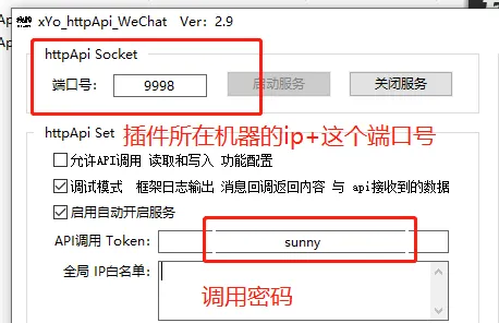 这个就是xyo插件cn.sxyo.xYo_httpApi_WeChat.xg.dll的外部调用地址。我们把它填入旺财狗的微信httpAPI地址里面,并将调用密码token设置一致。如图: