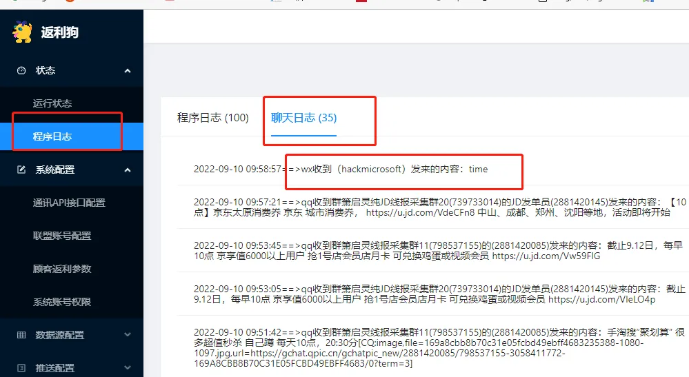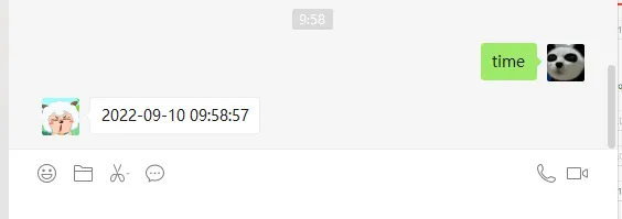 这样子,我们用其他微信号,向我们的机器人微信号,发送一个time指令,看看它能不能回复。能回复就代表调用成功了。不能回复可以看看旺财狗的日志,看看是不是哪里出错了。
