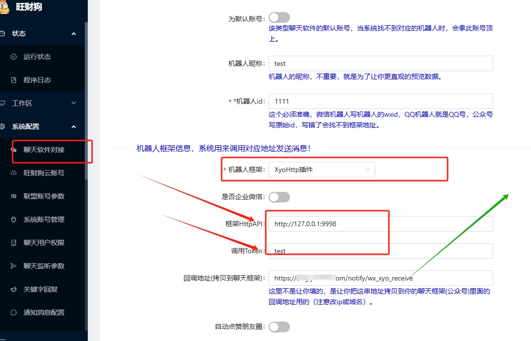 回调地址,如果旺财狗和西瓜框架不在一台机器,需要修改为对应的ip地址。