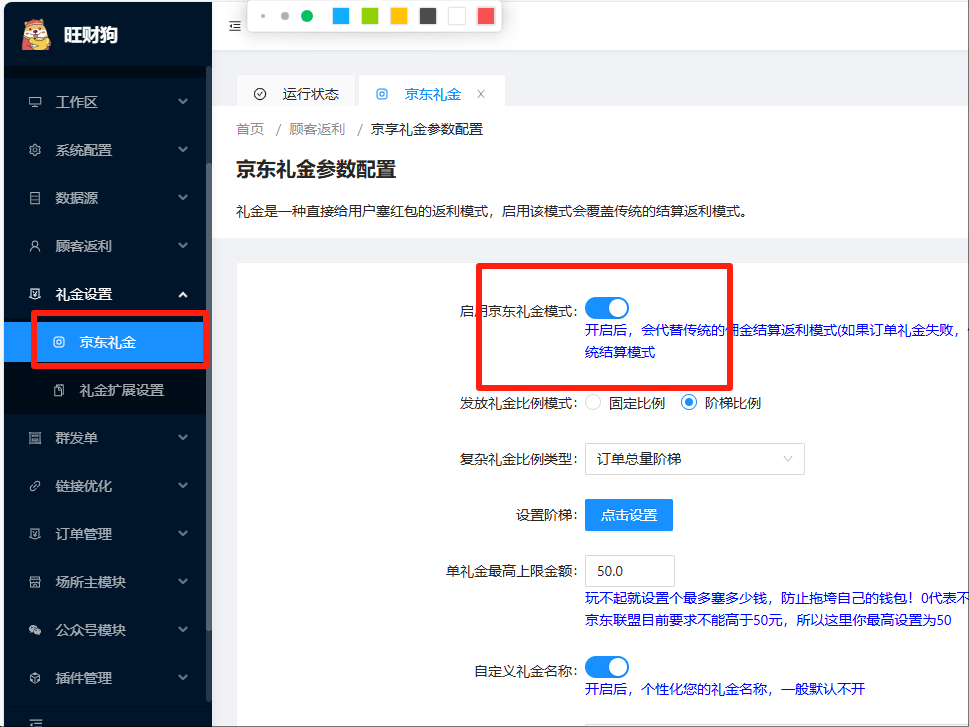 旺财狗左侧目录-"礼金设置"-“京东礼金设置”
