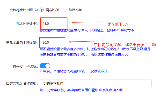礼金上限,设置为50元即可,因为目前京东礼金官方限定,单个礼金不能高于50,否则转链错误,你这里就设置为50.