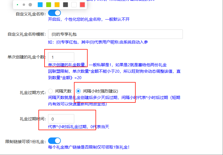 私聊单次创建礼金个数,这里设置为1即可。礼金过期方式,设置为当天有效为最好,因为有时候次日凌晨系统调价。会影响佣金收入。