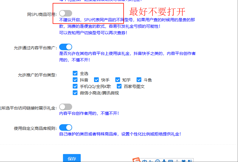 下面的同一spu上面可用不要打开,防止用户转链用的高价款,使用时用的低价款,造成不必要的损失。