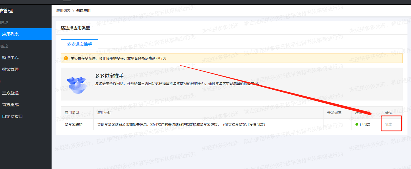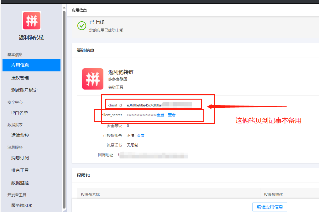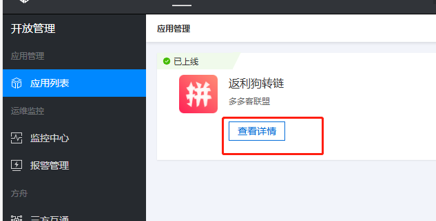 以上我们就把开放平台这边操作完成了,接下来进行一个多多进宝账号和开放平台的绑定。