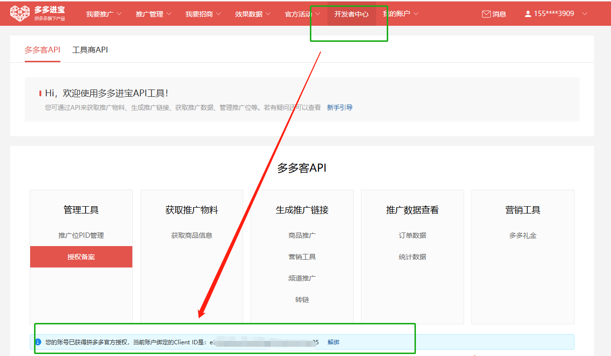 上图,我虽然已经绑定了,但是你如果没有绑定,这个页面的底部,会有个绑定的按钮或者链接,引导你把多多进宝和开放平台绑定到一起。