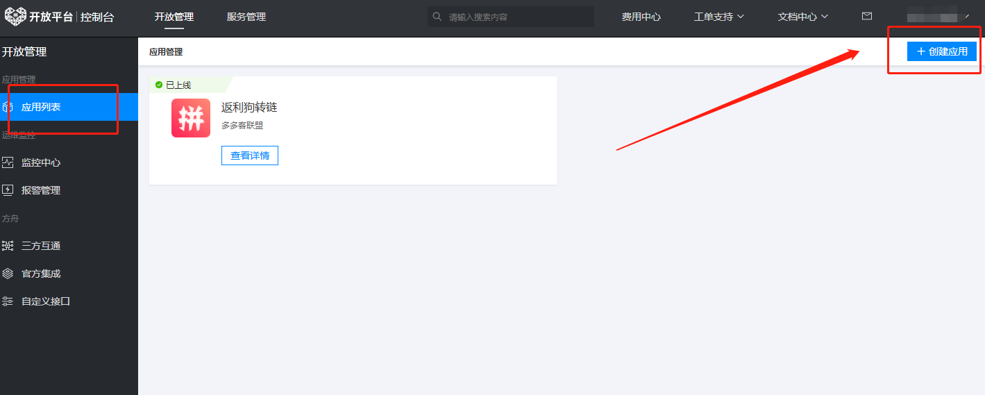 进入控制台后,点击左侧的“应用列表”-“右侧顶部”-“创建应用”,如图: