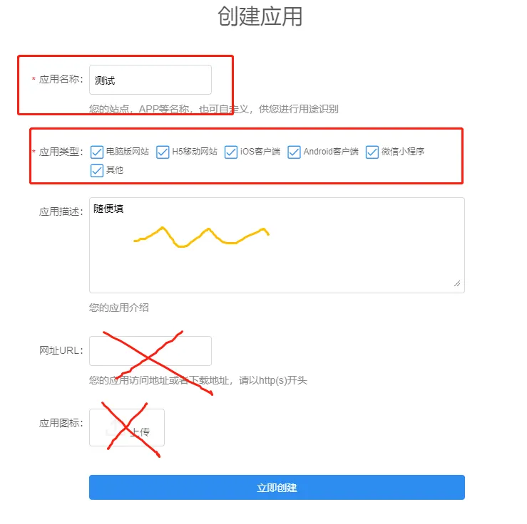 如下图:红叉不要填,红框必填,黄波浪可选。遇到让你填网址的地方,就瞎编一个。