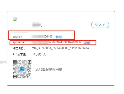 审核通过后就可以看到我们需要的大淘客账号信息:appkey和Appsecret,把这俩复制到记事本保存。