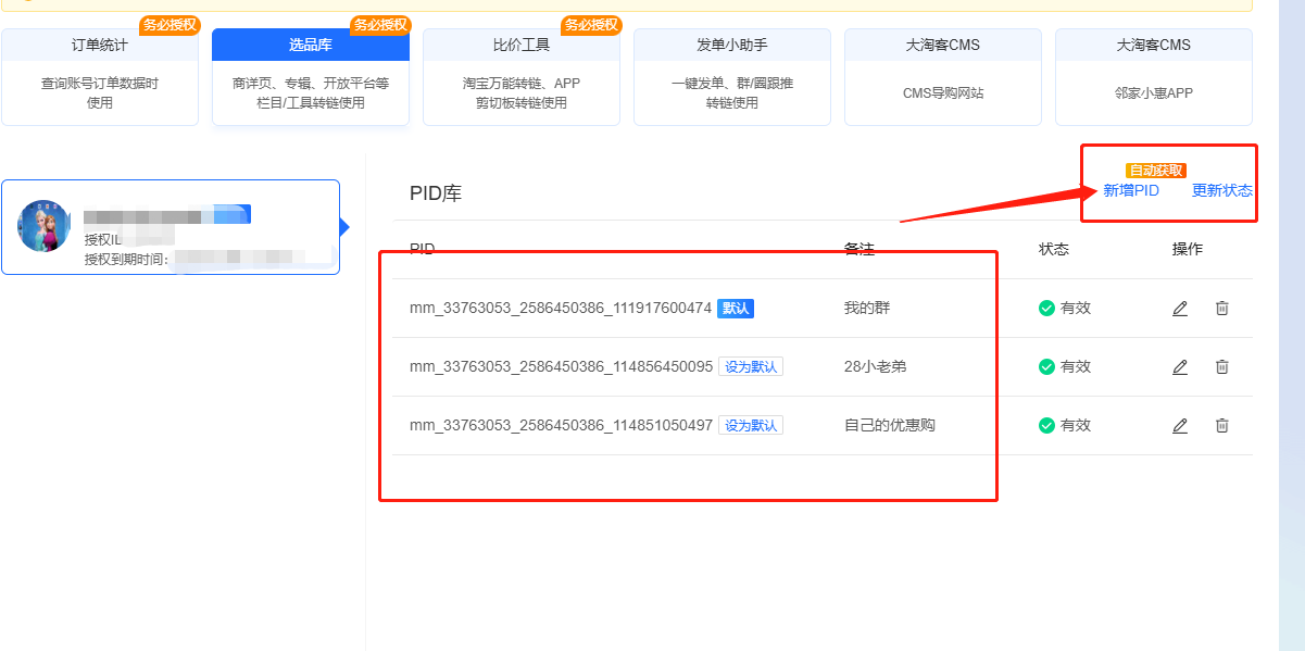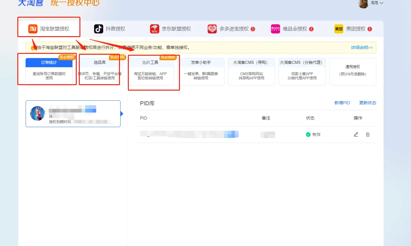 根据页面提示,把淘宝相关的能授权的都授权了,顺便把淘宝联盟创建的推广位都绑定了,如图: