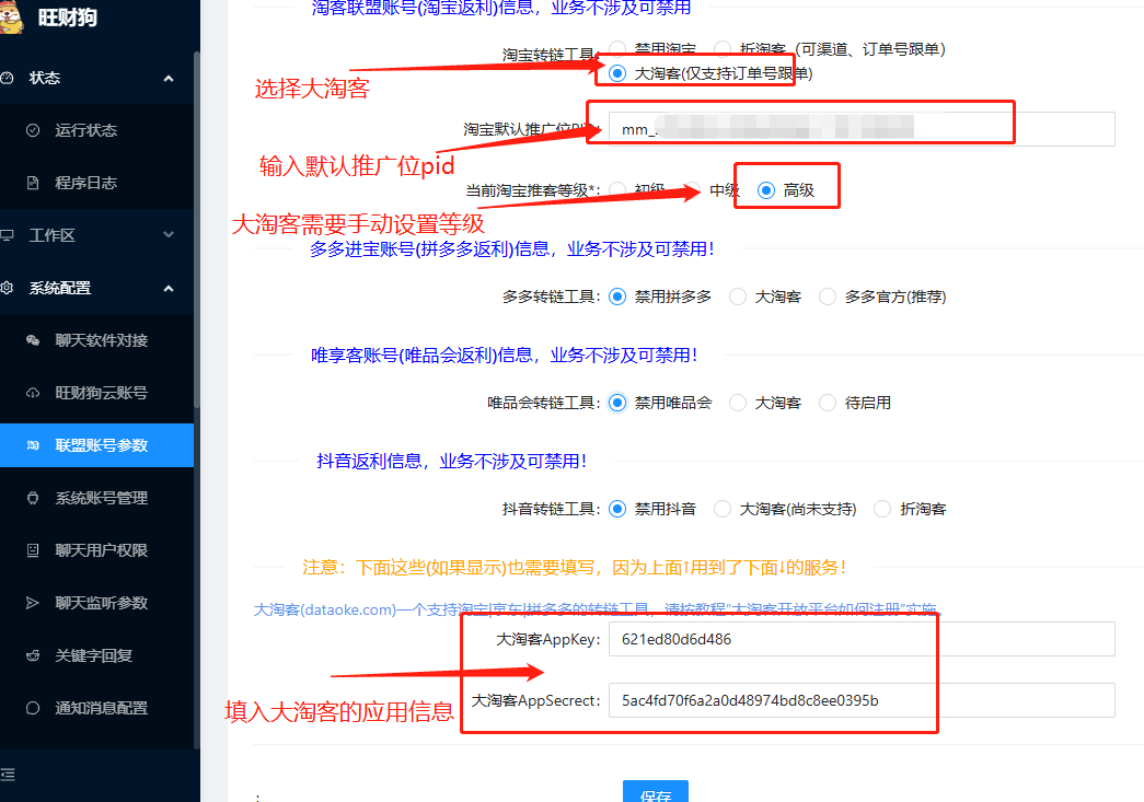 把上面记录下来的appkey和appsecrect填入返利狗的“系统配置”-“联盟账号配置”中的大淘客平台账号。