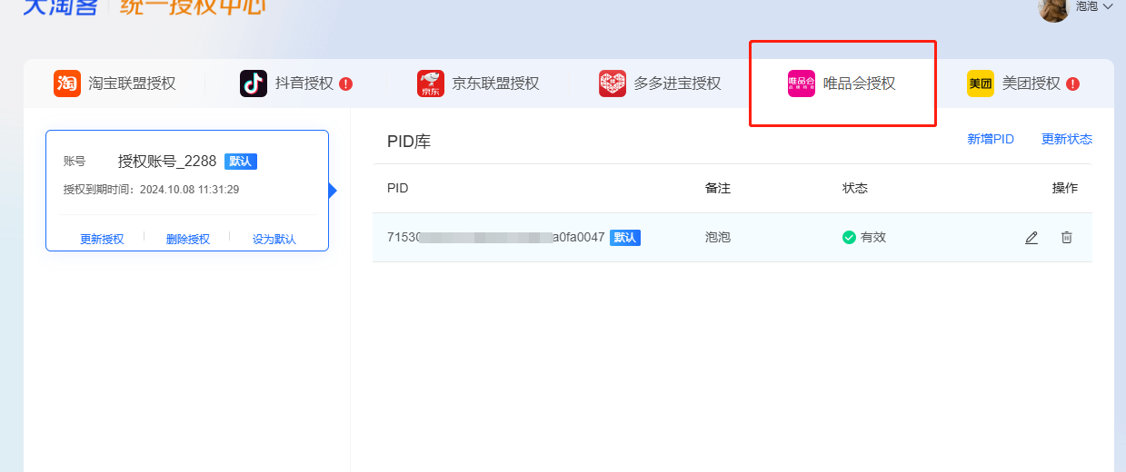 唯品会不知道官方有没有转链工具,基于唯品会的淘客数量太少,用唯品会授权的第三方转链工具商“大淘客”足矣够用。 本文就讲讲如何将唯享会的授权给大淘客。